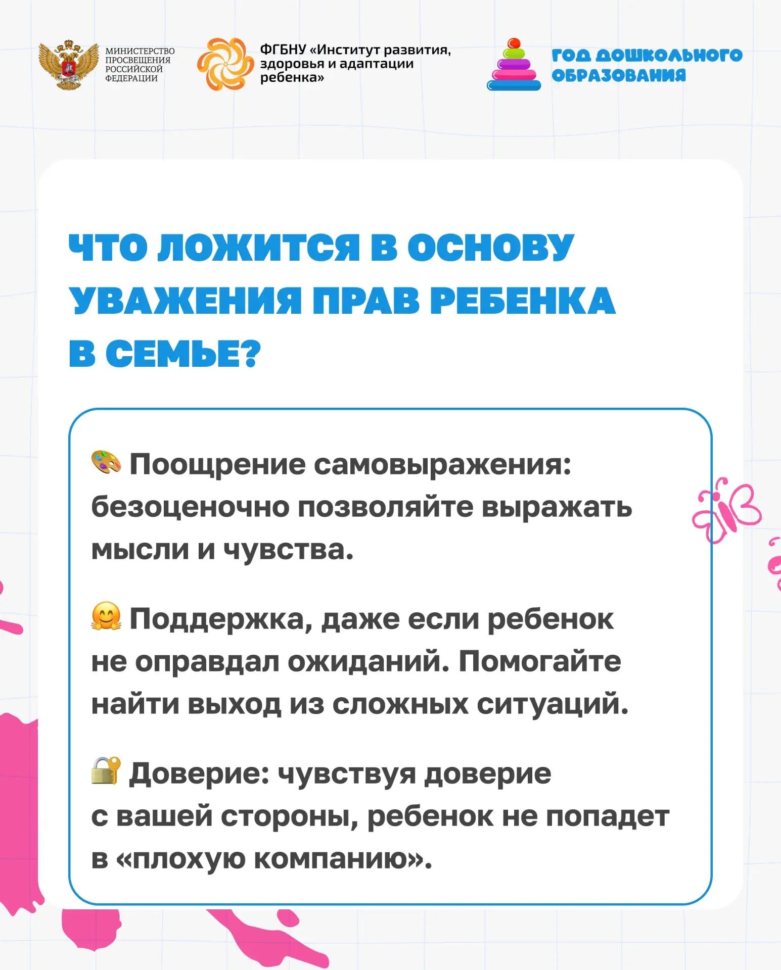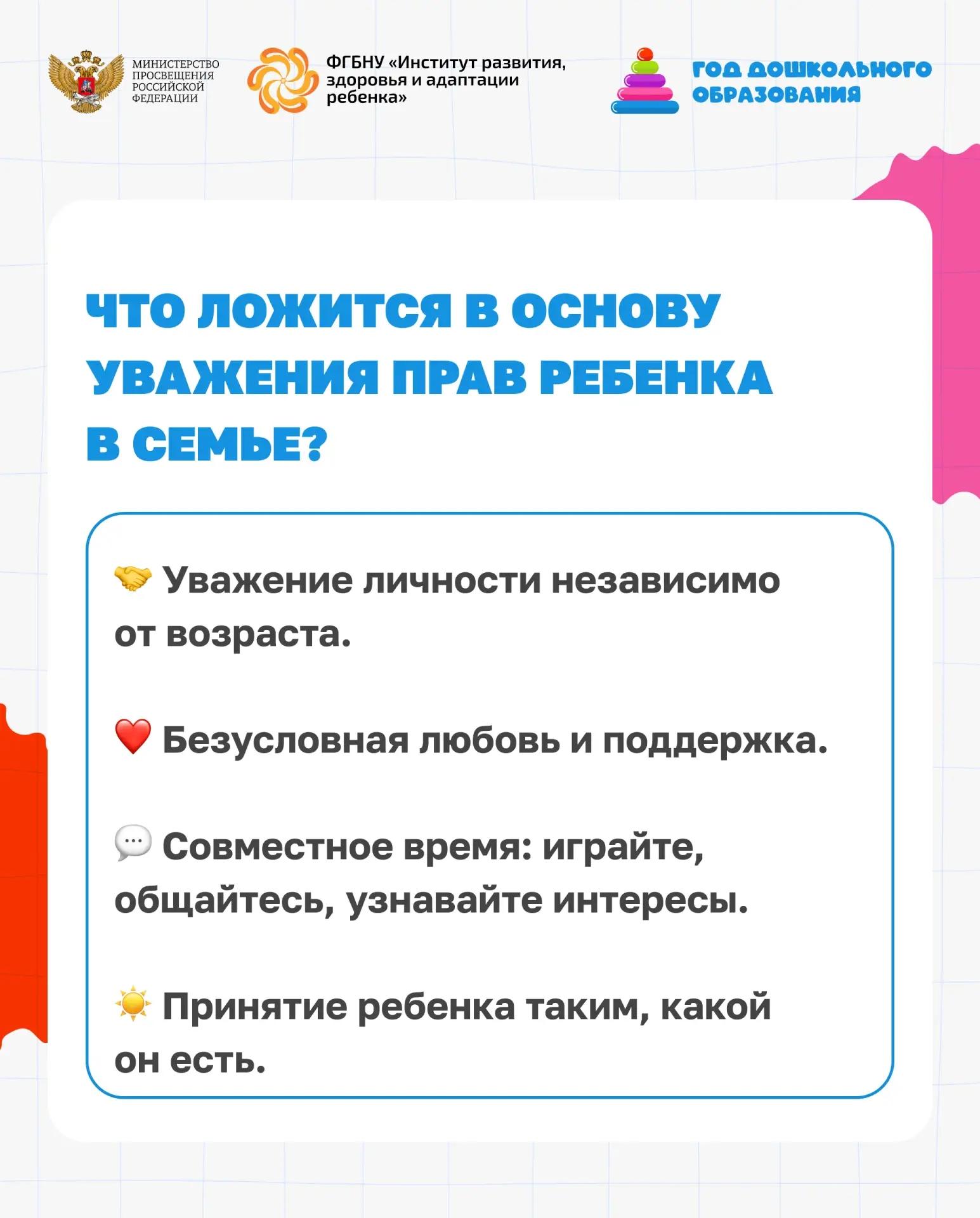 В инфографике специалисты Института развития, здоровья и адаптации ребенка напоминают об уникальности дошкольного периода и делятся принципами построения доверительных отношений в семье.